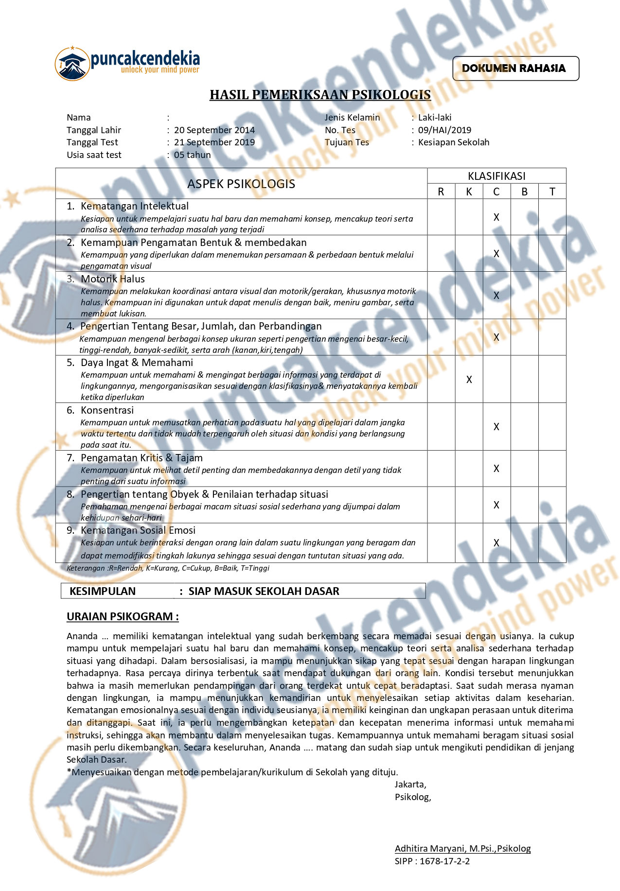Hasil tes disampaikan dalam laporan psikologis yang mudah dipahami, lengkap dengan rekomendasi praktis: